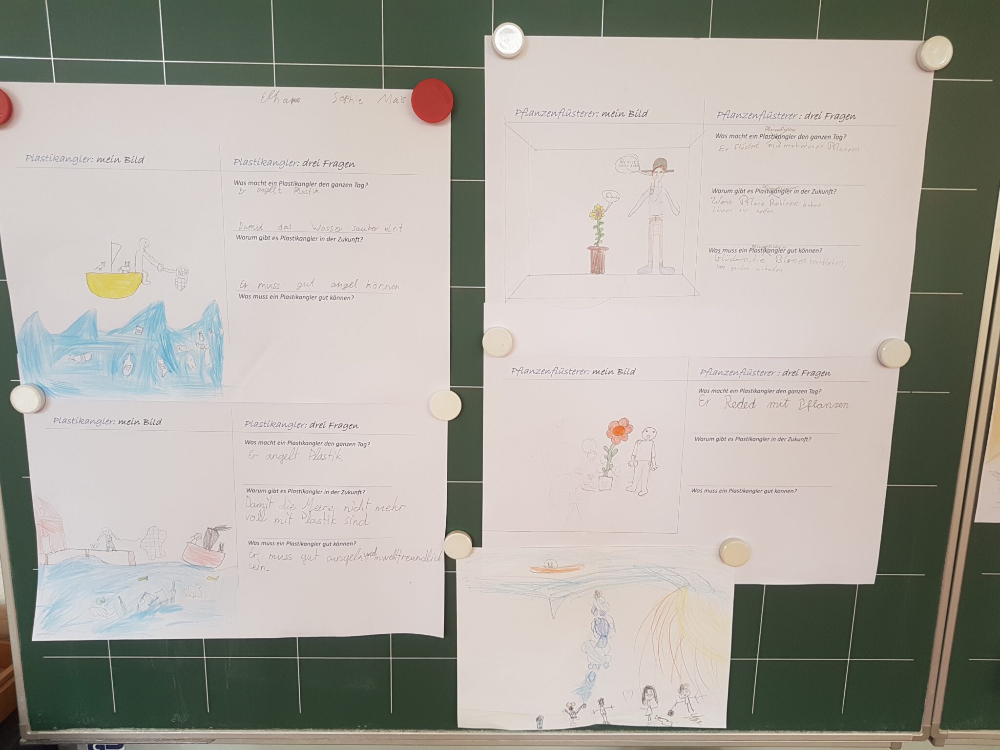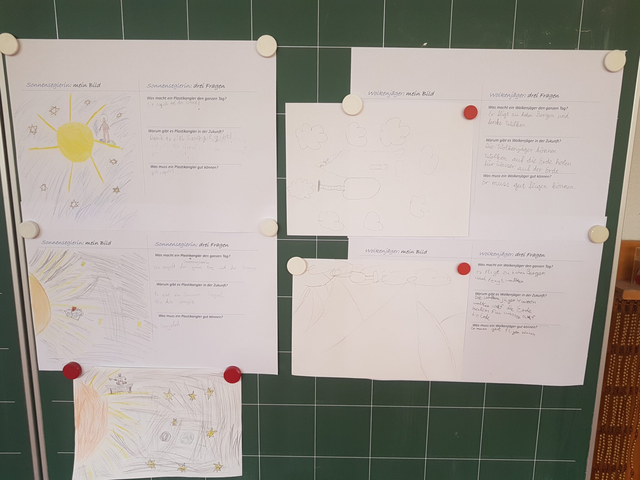 Wieder gab es einen tollen Lesetag, den Eltern organisiert hatten. Zu verschiedenen Themen kamen sie in die Klassen und haben uns Bücher vorgestellt, ein bisschen daraus vorgelesen und dann einen Arbeitsauftrag gestellt. Unsere Klasse hat den „Plastikangler und andere Jobs der Zukunft“ kennengelernt. Nachdem wir einige witzige Fantasiejobs aus dem Buch kannten, sollten wir uns den „Sonnensegler“, den „Pflanzenflüsterer“ und den „Wolkenfänger“ ausdenken. Was macht er? Wie sieht er aus? Warum ist der Job so wichtig?